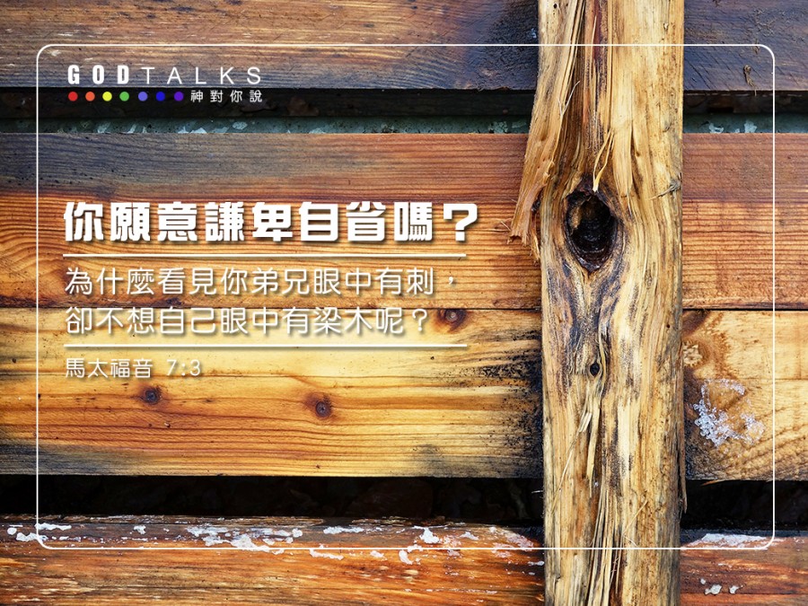 聖經中說為什麼看見你弟兄眼中有刺,卻不想自己眼中有梁木呢?這樑木代表的是「偏見」和「自以為是」,當這兩種態度存在我們生命中時,便會使我們的眼睛看不清楚。我們通常很容易覺得自己凡是都對,所以容易產生批判與抱怨,但是若我們願意謙卑自省,就可以讓聖靈來光照我們,使我們知道自己的眼中有多少樑木,並求聖靈施行拔出與醫治。