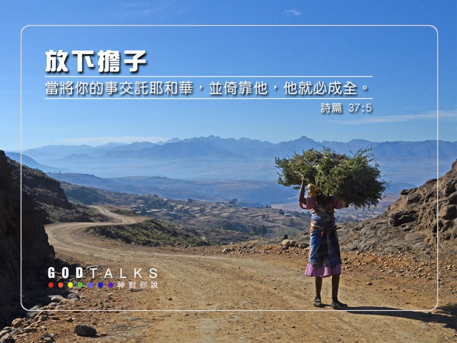 有一個小笑話:有一天某人開卡車要上山去,半路上看見一位老先生挑著很種的擔子,辛苦的往山上走。這人很好心告訴老先生可以順便送他到山上。老先生上到卡車後面後,這人從後視鏡往後一看,老先生肩上仍挑著擔子沒有放下來。這人問他:「你怎麼不把擔子放下來呢?」老先生回答說:「我已經搭你的車子,夠不好意思了,怎麼還好意思把擔子放在你的車上!」做為基督徒,我們有時是否也是這樣,「不好意思」把自己的重擔交給神,或是習慣性的捨不得放下?祂告訴我們沒關係,把一切都交給祂吧,祂是我們的神,在祂的能力之中沒有難成的事!