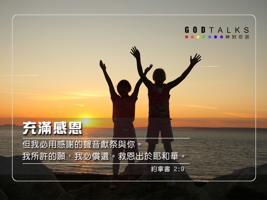 但我必用感謝的聲音獻祭與你。我所許的願,我必償還。救恩出於耶和華。 (約拿書 2:9)