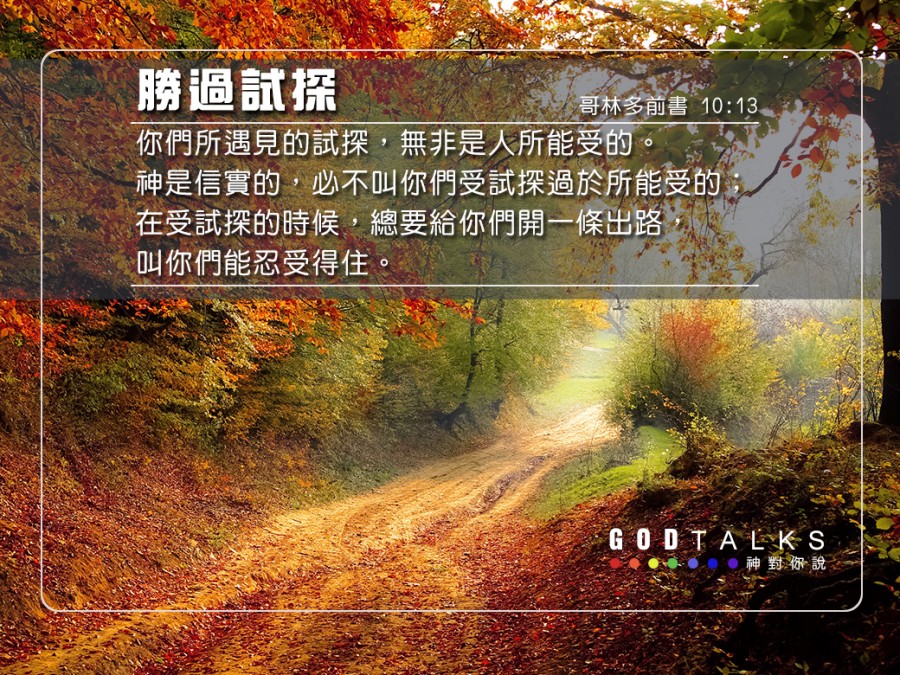 你們所遇見的試探,無非是人所能受的。神是信實的,必不叫你們受試探過於所能受的;在受試探的時候,總要給你們開一條出路,叫你們能忍受得住。 (哥林多前書 10:13)