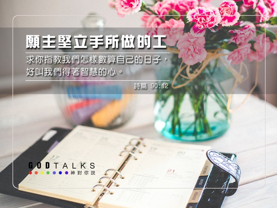 願神今天在心中對你說:孩子,你來看摩西為自己和以色列百姓如何禱告。他說:「求你使我們早早飽得你的慈愛,好叫我們一生一世歡呼喜樂。求你照著你使我們受苦的日子,和我們遭難的年歲,叫我們喜樂。願你的作為向你僕人顯現;願你的榮耀向他們子孫顯明。願主─我們神的榮美歸於我們身上。願你堅立我們手所做的工;我們手所做的工,願你堅立。」