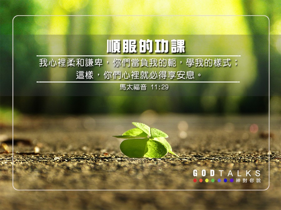 我心裡柔和謙卑,你們當負我的軛,學我的樣式;這樣,你們心裡就必得享安息。 (馬太福音 11:29)