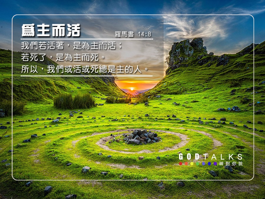 我們若活著,是為主而活;若死了,是為主而死。所以,我們或活或死總是主的人。 (羅馬書 14:8)
