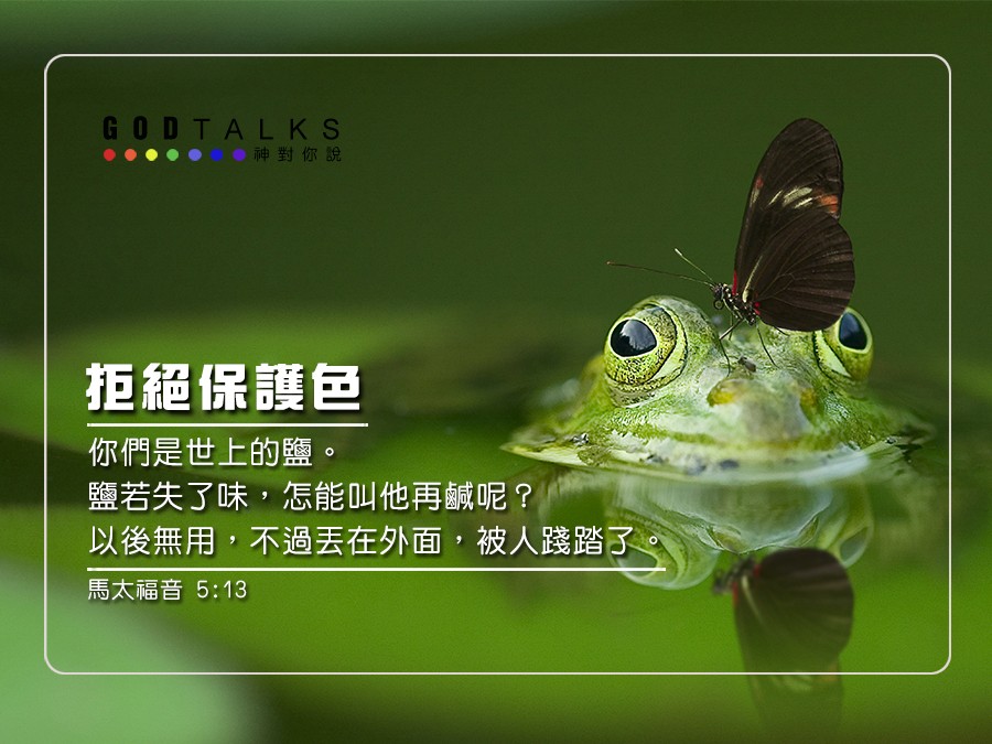許多生物都有保護色,這些生物可以讓自身的顏色變的與周圍的環境相似,讓敵人無法發現其存在。 作為人,我們也常常有屬於自己的保護色。很多事情我們明明知道什麼是對的,什麼是錯的 ,但為了擔心別人異樣的眼光,我們選擇沉默,把自己隱藏在世俗的洪流之中。其實,聖經教導我們,要做世人的光和鹽,有些時候我們必須學習站出來為神發聲,不能永遠選擇隱藏自己,否則終究有一天會被這個世界所吞沒。