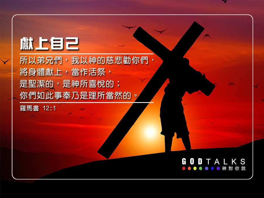 所以弟兄們,我以神的慈悲勸你們,將身體獻上,當作活祭,是聖潔的,是神所喜悅的;你們如此事奉乃是理所當然的。 (羅馬書 12:1)