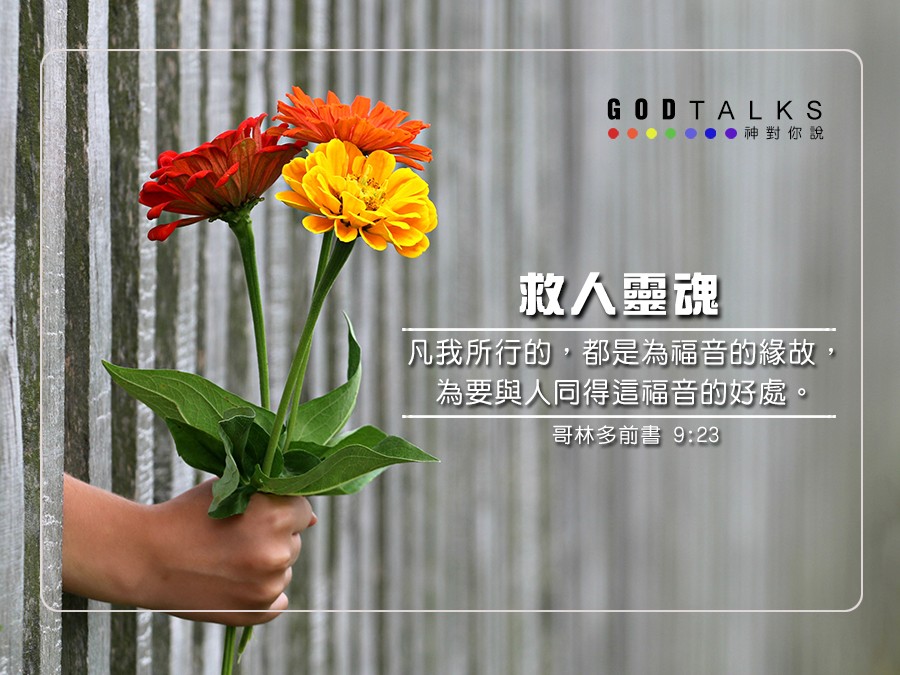 凡我所行的,都是為福音的緣故,為要與人同得這福音的好處。 (哥林多前書 9:23)