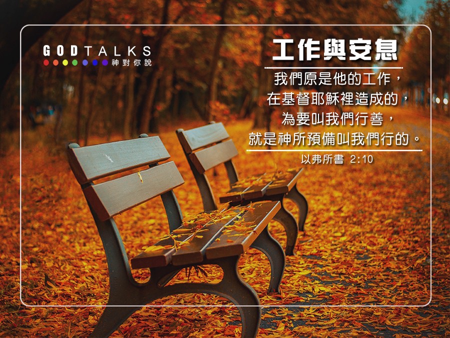 願神今天在心中對你說:孩子,工作是我創造人類的目的,是我給人的恩典和祝福,你要透過工作,得著我所給的不同恩賜,但不可只忙碌於工作、被工作綑綁,要記得來到我面前享受安息。