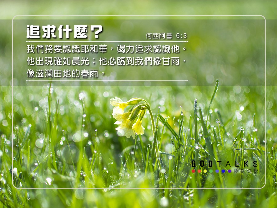 我們務要認識耶和華,竭力追求認識他。他出現確如晨光;他必臨到我們像甘雨,像滋潤田地的春雨。 (何西阿書 6:3)
