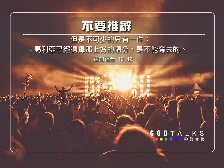 但是不可少的只有一件;馬利亞已經選擇那上好的福分,是不能奪去的。」 (路加福音 10:42)