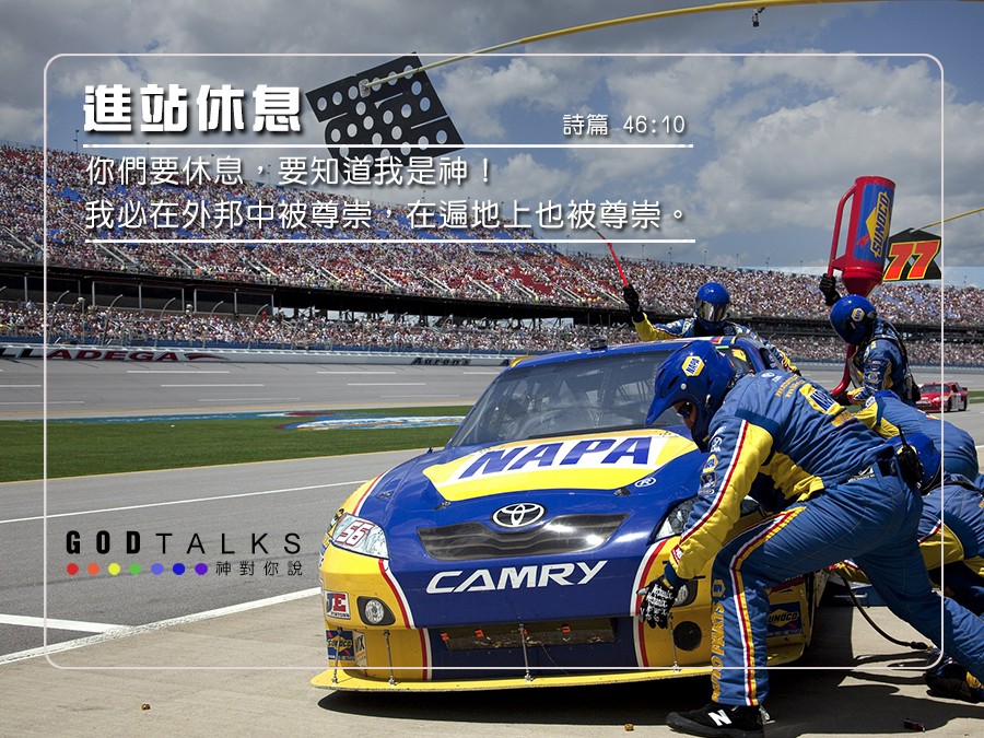 看過F1賽車的人都知道,賽車手每比賽一段時間就必須要進站換輪胎,即使需要耽誤幾秒鐘的時間, 也不能讓輪胎承受在比賽中爆胎的風險。我們的人生也是一樣,神沒有要我們一直沒命的往前衝、往前跑,即使是服事也是如此。偶爾停下來休息,把自己整理一下再重新出發是絕對必要的。 這也是神為什麼要在舊約聖經中設立安息日的原因。