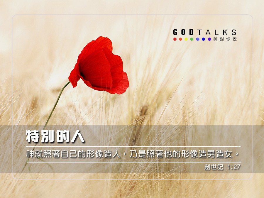 願神今天在心中對你說:孩子,你是按照我的形象所造的。你是特別且獨一無二的。你是我的孩子、我的寶貝。我必與你同在。
