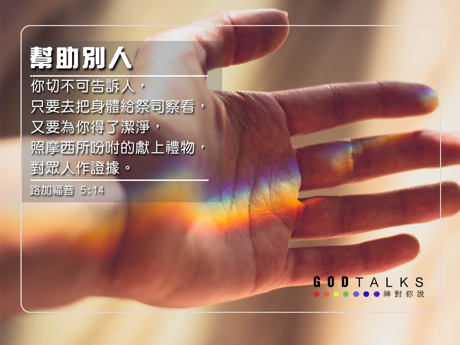 耶穌囑咐他:「你切不可告訴人,只要去把身體給祭司察看,又要為你得了潔淨,照摩西所吩咐的獻上禮物,對眾人作證據。」 (路加福音 5:14)