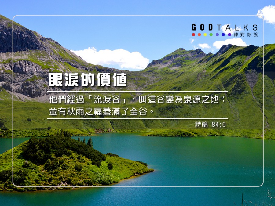 願神今天在心中對你說:孩子,我知道你的眼淚中有愁苦、憂傷,更有你的罪惡悔恨,當你經過流淚谷就變為泉源之地,可以流出喜樂,甘甜之水要結出佳美,每一滴眼淚都要變成珍珠。
