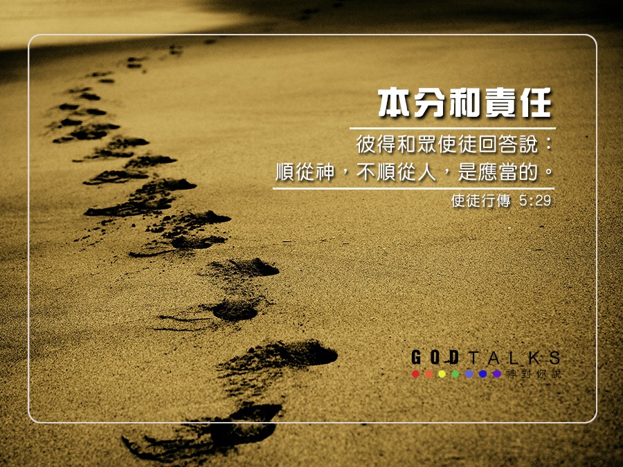 彼得和眾使徒回答說:「順從神,不順從人,是應當的。 (使徒行傳 5:29)